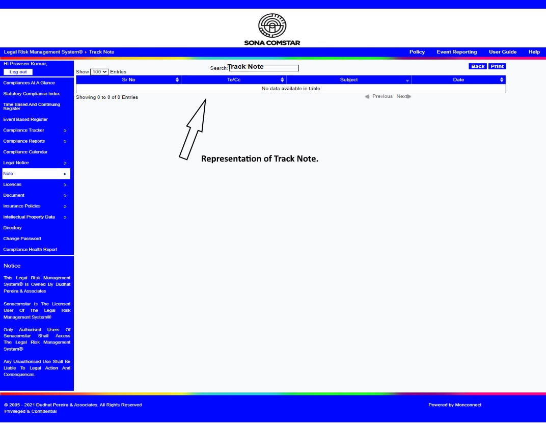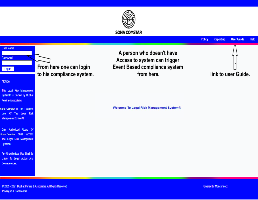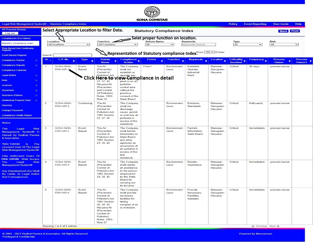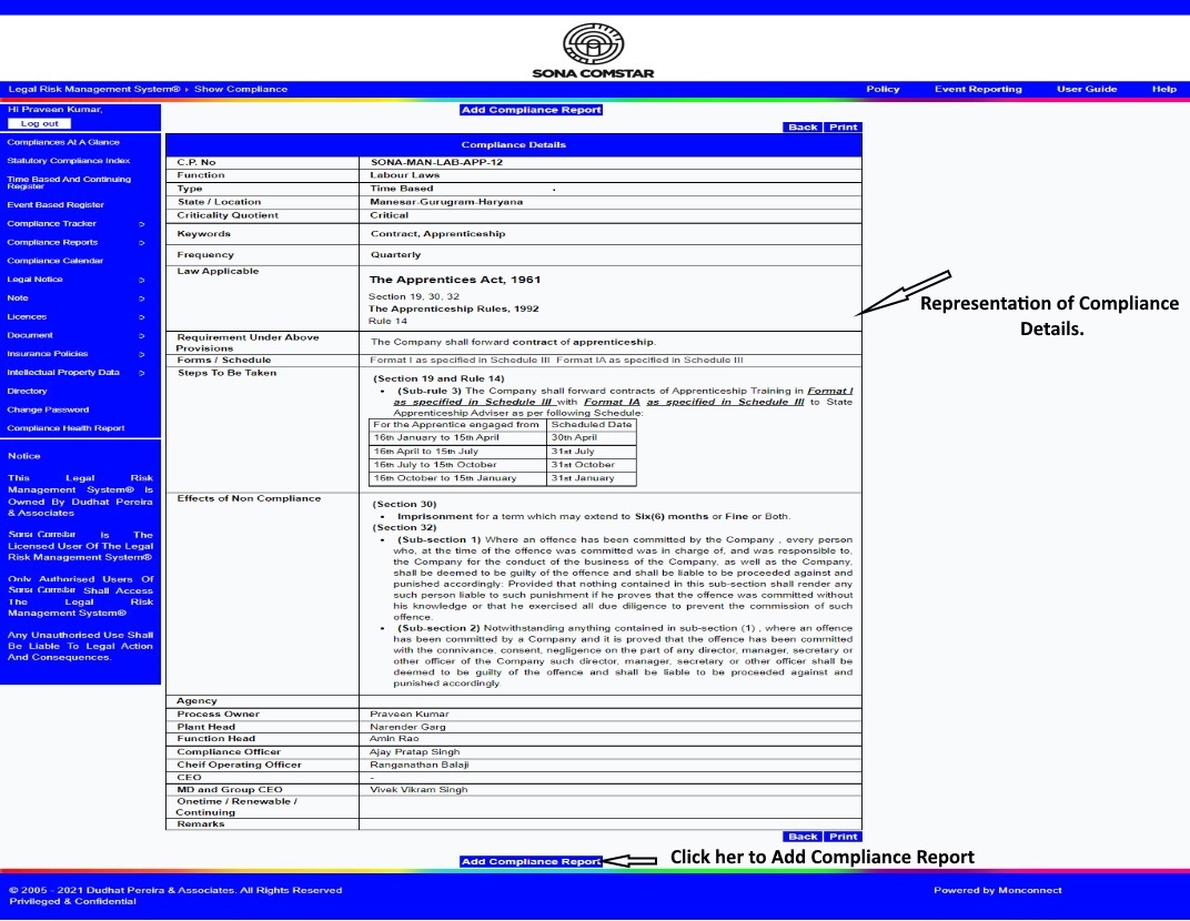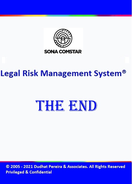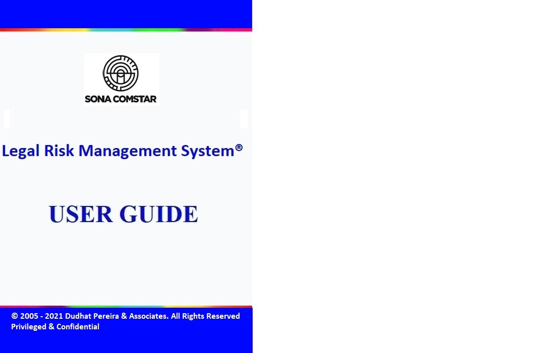 This Legal Risk Management System® is a proprietary work of Dudhat Pereira & Associates. No part of this Legal Risk Management System® may be reproduced or copied in any form or by any means (graphic, electronic or mechanical including but not limited to printing, photocopying, recording, taping or information retrieval system) or reproduced on any disc, tape, perforated media or other information storage device etc without prior written permission of Dudhat Pereira & Associates. Breach of this condition is liable for legal action.