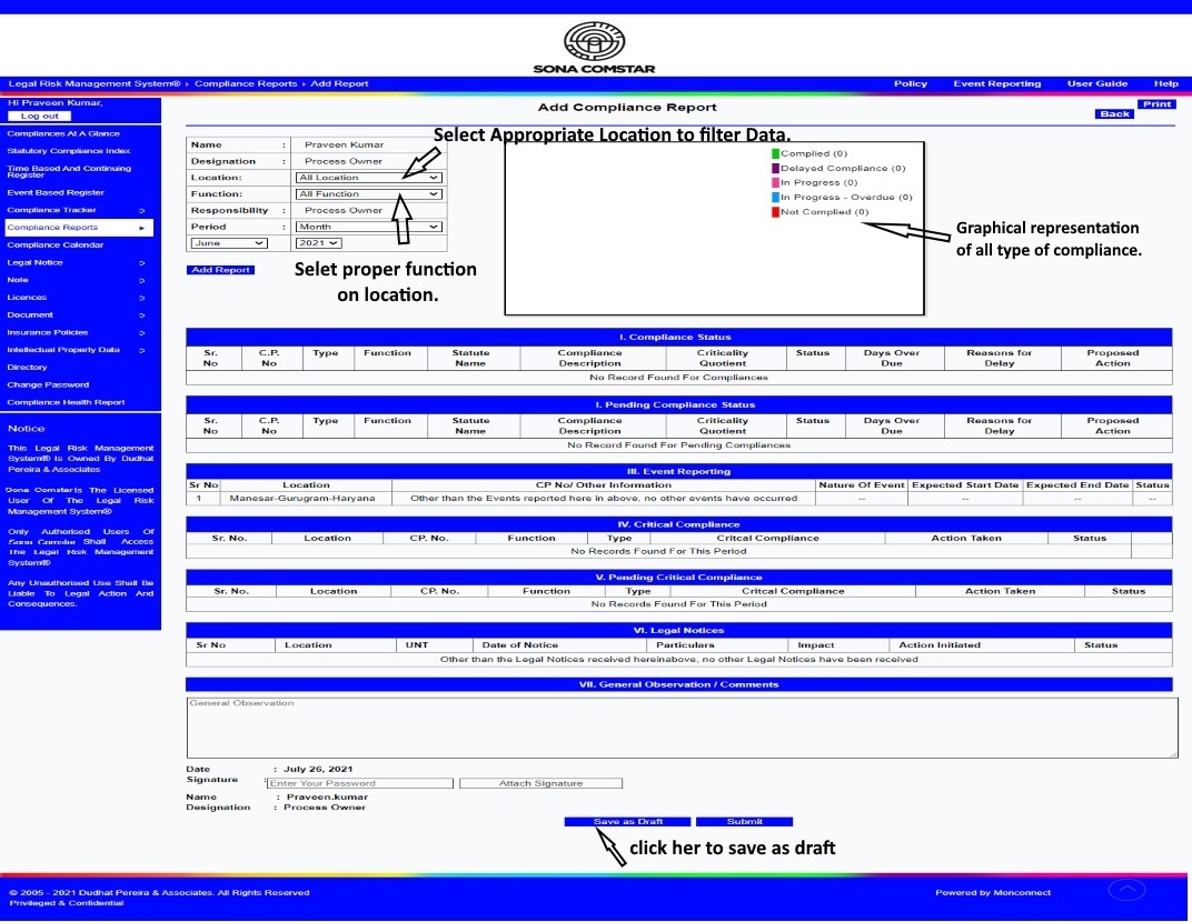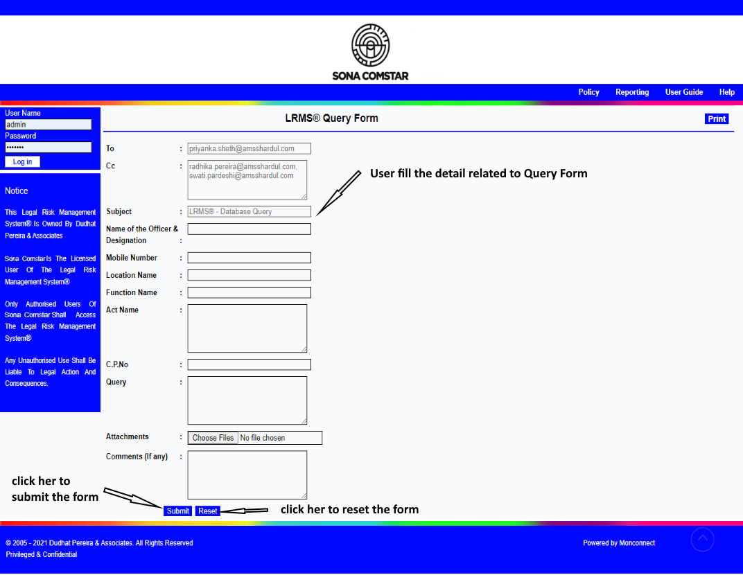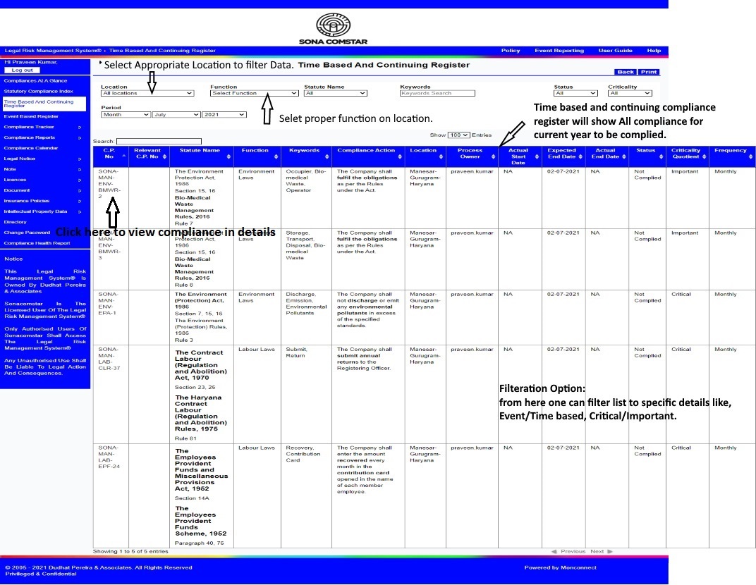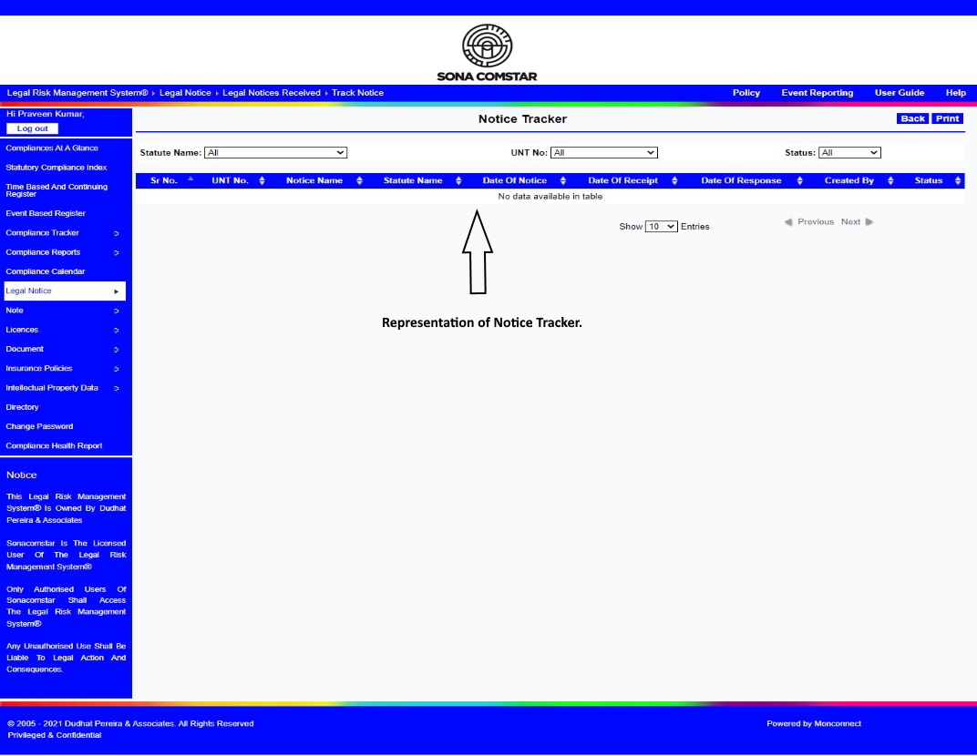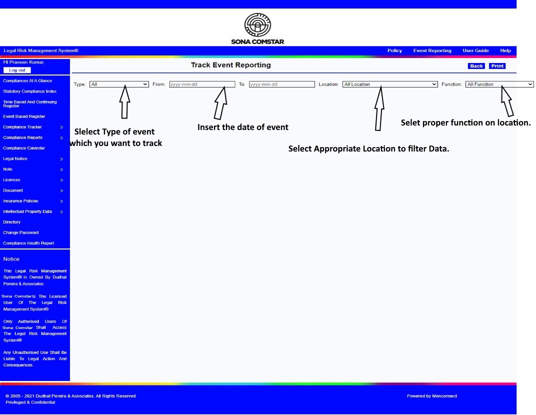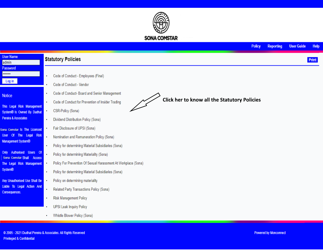 This Legal Risk Management System® is a proprietary work of Dudhat Pereira & Associates. No part of this Legal Risk Management System® may be reproduced or copied in any form or by any means (graphic, electronic or mechanical including but not limited to printing, photocopying, recording, taping or information retrieval system) or reproduced on any disc, tape, perforated media or other information storage device etc without prior written permission of Dudhat Pereira & Associates. Breach of this condition is liable for legal action.